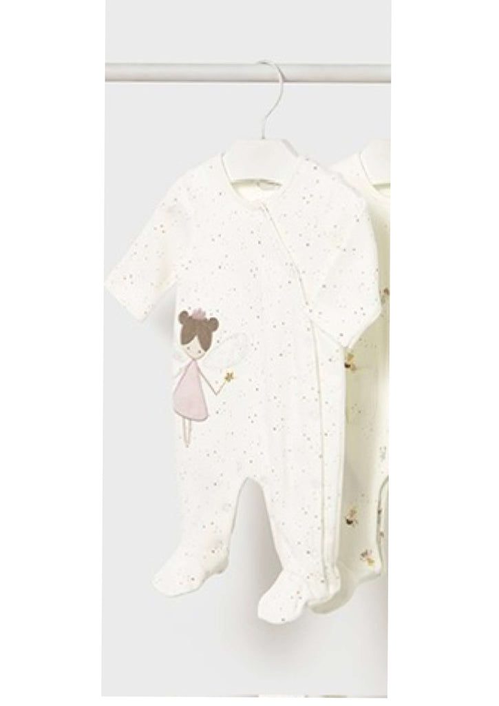 This beautiful Mayorsl ivory fairy babygrow  is perfect for little girls. It features a delightful all-over star print with a cute fairy appliqué on the front. Designed with convenience in mind, it fastens with poppers down the front and between the legs for easy dressing and changing.