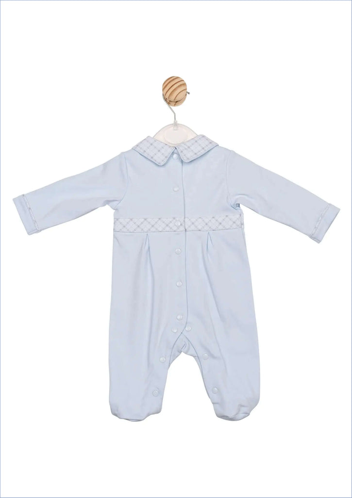 This charming Mintini pale blue checked babygrow for baby boys is crafted in soft cotton for a gentle feel against delicate skin. Designed with a smart checked collar, matching feet, and a coordinating band across the chest, it offers both comfort and classic style. Practical popper fastenings down the back ensure easy dressing and changing.