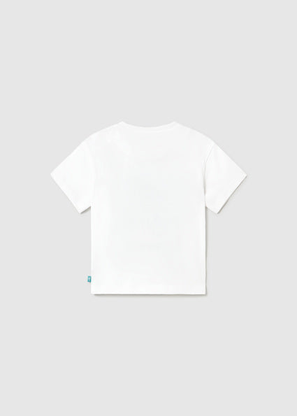 The Mayoral white dinosaur t-shirt for little boys features a fun and adventurous dinosaur graphic that adds a playful touch to everyday outfits. Made from soft, comfortable fabric, it’s perfect for playtime, outings, and warm-weather days. It has popper fastening on the shoulder for easing changing.